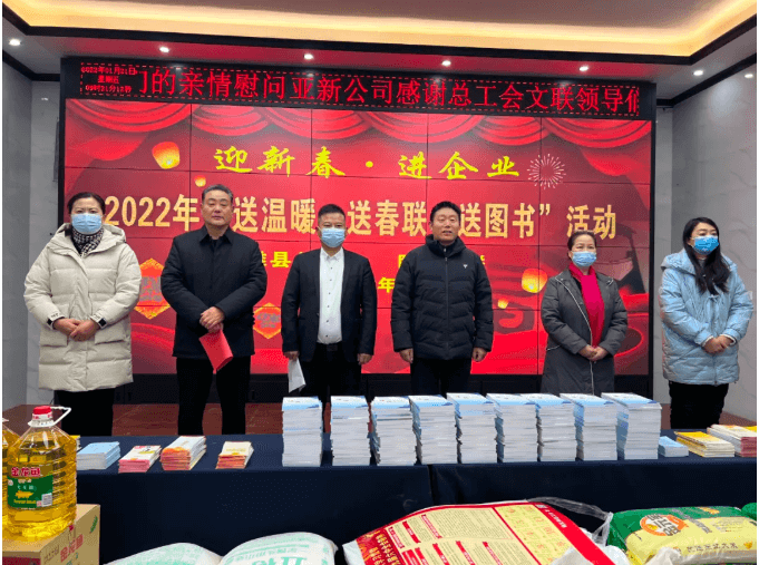 1月21日上午,睢縣總工會(huì)聯(lián)合縣文聯(lián)在亞新公司開展迎新春、進(jìn)企業(yè)2022年“送溫暖、送春聯(lián)、送圖書”活動(dòng),把黨和政府的關(guān)懷、工會(huì)組織的溫暖及時(shí)送到職工群眾的心坎上,縣總工會(huì)黨組書記、常務(wù)副主席陳宏杰、縣文聯(lián)主席薛黨軍、縣總工會(huì)黨組成員閆寒梅、耿俊麗、縣文聯(lián)副主席陳愛英出席活動(dòng)。