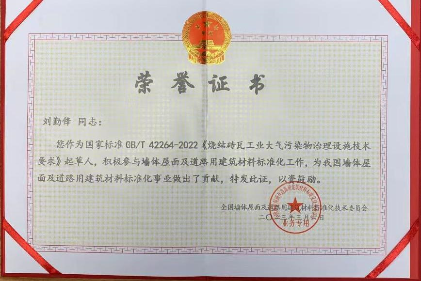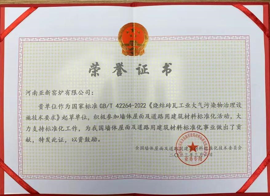 近日,全國(guó)墻體屋面及道路用建筑材料標(biāo)準(zhǔn)化技術(shù)委員會(huì),頒發(fā)榮譽(yù)證書,表彰GB/T 42264-2022《燒結(jié)磚瓦工業(yè)大氣污染物治理設(shè)施技術(shù)要求》國(guó)家標(biāo)準(zhǔn)起草單位--河南亞新窯爐有限公司和河南亞新窯爐有限公司董事長(zhǎng)劉勤鋒。