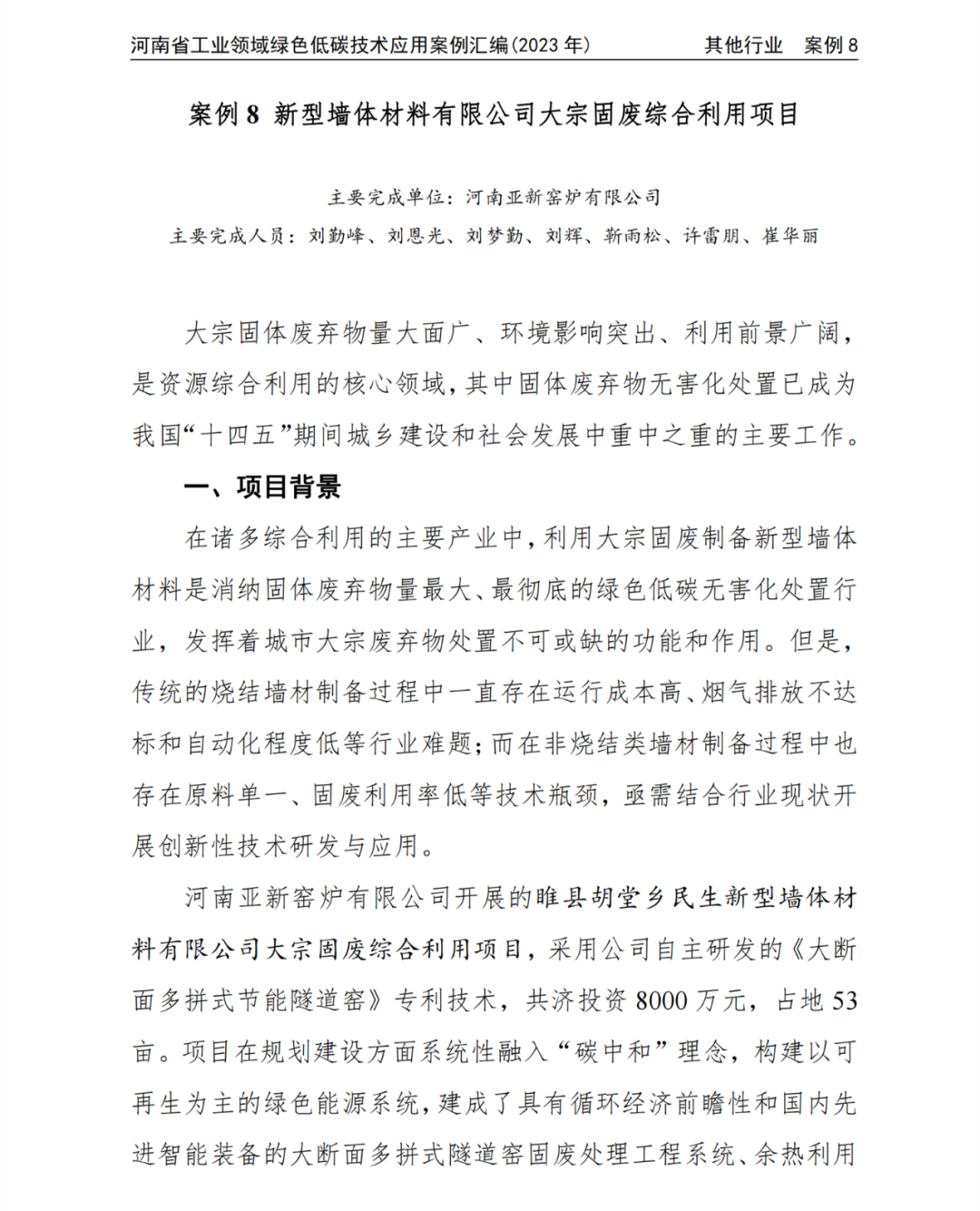工業(yè)領(lǐng)域綠色低碳技術(shù)應(yīng)用案例匯編是為深入實(shí)施河南省綠色低碳轉(zhuǎn)型戰(zhàn)略,貫徹落實(shí)《河南省制造業(yè)綠色低碳高質(zhì)量發(fā)展三行動計劃(2023—2025年)》《河南省工業(yè)領(lǐng)域碳達(dá)峰實(shí)施方案》,河南省工業(yè)和信息化廳持續(xù)推進(jìn)工業(yè)節(jié)能節(jié)水、綠色制造、資源循環(huán)利用及污染防治各項(xiàng)工作,涌現(xiàn)出的一批技術(shù)先進(jìn)、管理科學(xué)、運(yùn)行可靠的綠色低碳項(xiàng)目。亞新公司不斷加大技術(shù)研發(fā),利用大宗固廢制備新型墻體材料來消納固體廢棄物、實(shí)現(xiàn)綠色低碳無害化技術(shù)要求,處置城市、鄉(xiāng)村大宗廢棄物,進(jìn)一步助力綠色低碳行業(yè)發(fā)展。