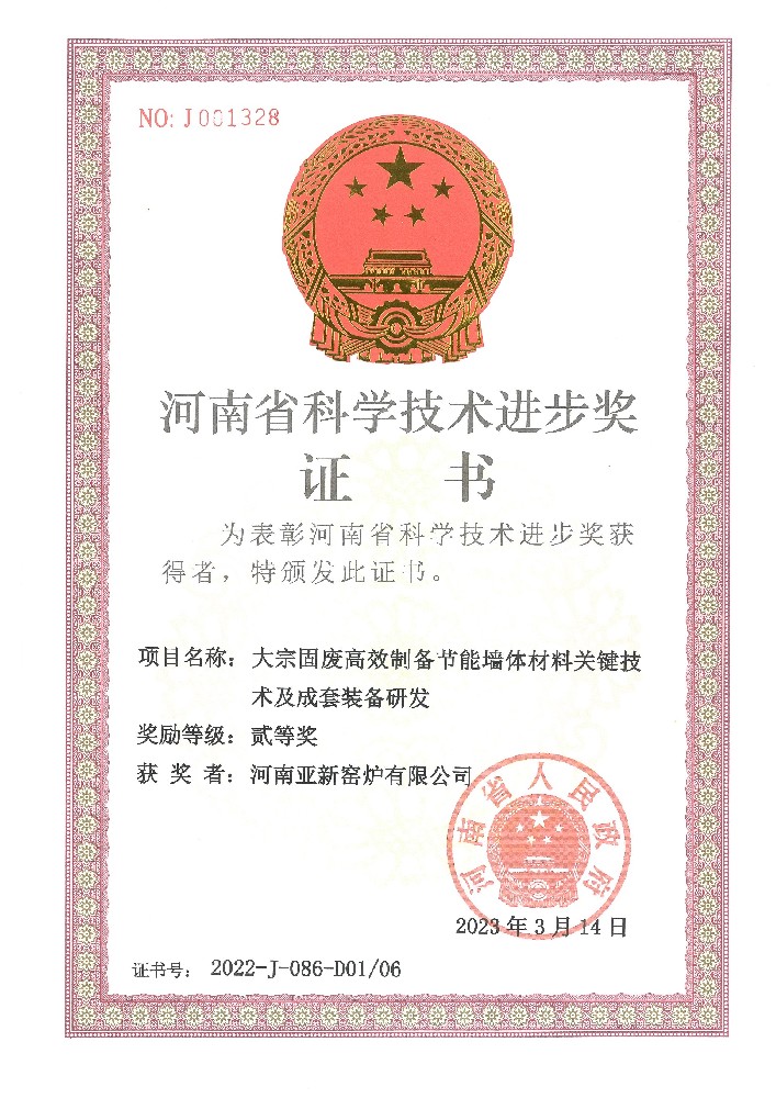 河南亞新窯爐有限公司是國家高新技術(shù)企業(yè)、河南省專精特新企業(yè)、河南省綠色技術(shù)創(chuàng)新示范企業(yè)、 中國磚瓦協(xié)會副會長單位、全國墻材科技信息網(wǎng)副理事長單位、河南省節(jié)能環(huán)保隧道窯工程技術(shù)研究中心、《河南省節(jié)能低碳與環(huán)境污染防治技術(shù)指導(dǎo)目錄》企業(yè)、河南省綠色技術(shù)創(chuàng)新示范企業(yè),具有窯爐設(shè)計(jì)和冶金工程施工總承包(窯爐施工)資質(zhì),是專業(yè)從事各類固廢處置與資源化綜合利用智能裝備制造的創(chuàng)新科技型企業(yè)。亞新窯爐在墻材行業(yè)率先通過質(zhì)量、環(huán)境、職業(yè)健康安全管理體系三個(gè)認(rèn)證:2017年編寫制定了《移動式節(jié)能隧道窯》企業(yè)標(biāo)準(zhǔn),2018年參與《墻材工業(yè)用移動式隧道窯》行業(yè)標(biāo)準(zhǔn)的起草與制定,參與國家質(zhì)量監(jiān)督檢驗(yàn)檢疫總局和國家標(biāo)準(zhǔn)化管理委員會《磚瓦工業(yè)隧道窯熱平衡、熱效率測定與計(jì)算方法》國家標(biāo)準(zhǔn)的制定,2019 年推出《大斷面多拼式節(jié)能隧道案》,在墻體材料燒結(jié)方面進(jìn)行了顛覆性創(chuàng)新:2020年主持制定了河南省《多拼式大斷面節(jié)能隧道案技術(shù)標(biāo)準(zhǔn)》第一條地方標(biāo)準(zhǔn), 2022年,亞新公司作為第一牽頭人研發(fā)的《大宗固廢高效制備節(jié)能墻體材料關(guān)鍵技術(shù)及成套裝備研發(fā)》科技成果獲得河南省科學(xué)技術(shù)進(jìn)步獎(jiǎng)二等獎(jiǎng):2023年亞新公司獲得河南省綠色創(chuàng)新企業(yè)。
